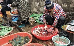 What was so specific on that kind of Chinese market ? I believe that nobody really want to imagine or even to know what those markets are organised and what is on the menu. We talk about the any absence of compassion but rather about naked hunger that is satisfied through eating of everything, even the bush meat and uncooked raw food:“At such markets, outdoor stalls are squeezed together to form narrow lanes, where locals and visitors shop for cuts of meat and ripe produce. A stall selling hundreds of caged chickens may abut a butcher counter, where uncooked meat is chopped as nearby dogs watch hungrily. Vendors hock skinned hares, while seafood stalls display glistening fish and shrimp.Wet markets put people and live and dead animals – dogs, chickens, pigs, snakes, civets, and more – in constant close contact. That makes it easy for a virus to jump from animal to human.”
