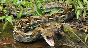 The giant anaconda is, with no doubt, the largest known snake in the world, considering its weight and length. This proud snake queen could be even 9 meters(30 feet) long and obtain 227 kilograms(550 founds). This swimming reptile is also known to be considered as the part of boa family or common water boa. Its original name Eunectes murinus actually mean the good swimmer, in Greek language. This snake is more than only a good swimmer, this is rather kind of water dancer and professional diver. According to Bill Heyborne, a herpetologists and professor of biology at Utah University, there are more types of anaconda, in spite of fact that people only recognise and talk about the one, giant, green anaconda. This one is the largest but not the only one. There are also yellow or Paraguayan anaconda, the dark-spotted anaconda and the Beni or Bolivian anaconda. For experts, they are all different but for amateurs , they are all scary.
